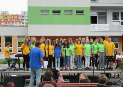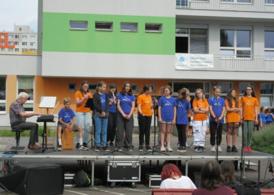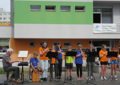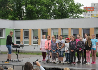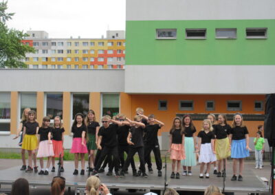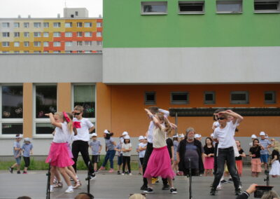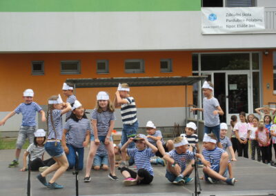Na pódiu mohli návštěvníci sledovat vystoupení školního sboru flétnistů Polabinské píšťalky pod vedením pana učitele Dohunka i školního pěveckého sboru pod vedením pana učitele Slabého, dále pak různá hudební a taneční vystoupení žáků prvního ročníku.