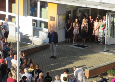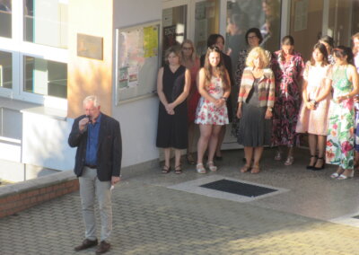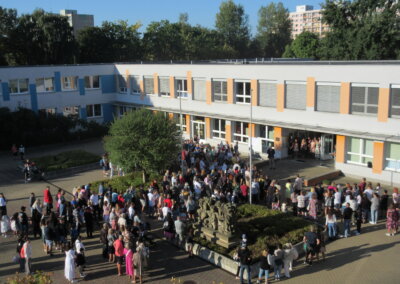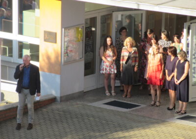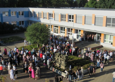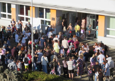 V pondělí 1. září 2025 přivítal pan ředitel František Němec v 8.00 před školou žáčky prvních tříd a jejich rodiče. Než je pozval do školy, představil jim jejich paní učitelky, asistentky a vychovatelky. Pro žáky vyšších ročníků se dveře školy otevřely až od druhé vyučovací hodiny.
