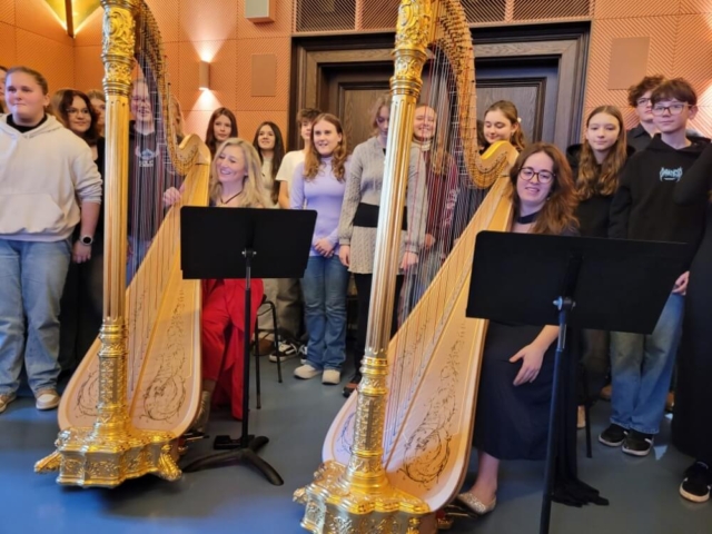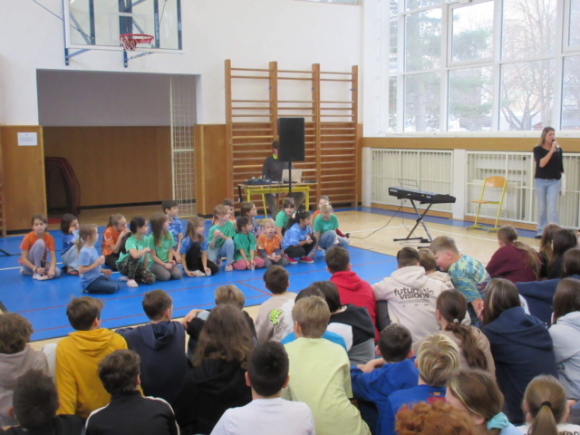 Na závěr si žáci naší školy za doprovodu obou harfistek společně zazpívali titulní píseň z pohádky Anděl Páně 2, což bylo krásným vyvrcholením celého hudebního setkání.