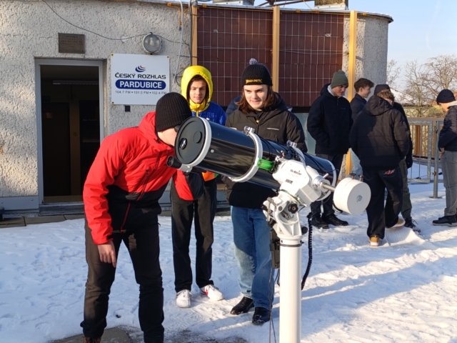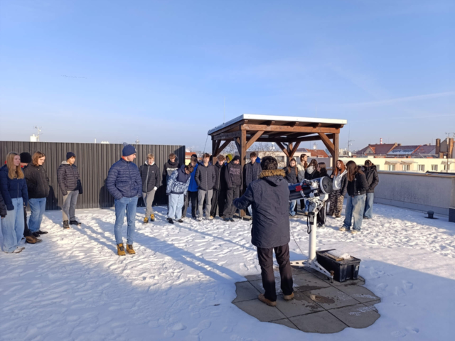 V pátek 28. listopadu že žáci 9.A vypravili do pardubické Hvězdárny barona Krause na velkou jízdu vesmírem. Přálo jim počasí, a tak mohli návštěvu završit pozorováním slunečních skvrn na terase hvězdárny.